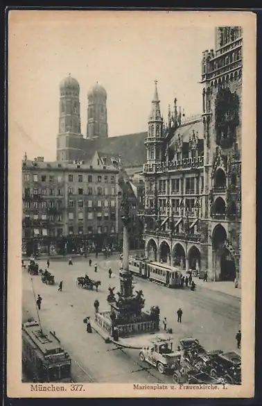 AK München, Marienplatz und Frauenkirche mit Strassenbahn
