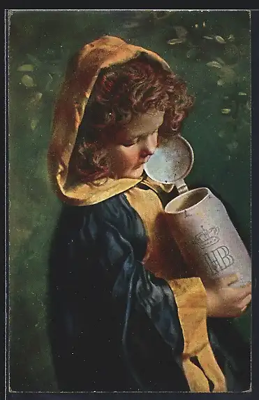 AK München, Münchener Kindl mit leerem Hofbräuhaus-Bierkrug