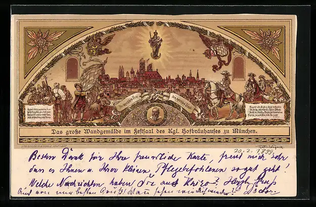 AK München, Münchner Hofbräuhaus, grosses Wandgemälde im Festsaal, Innenansicht, Mutter Gottes, Engel