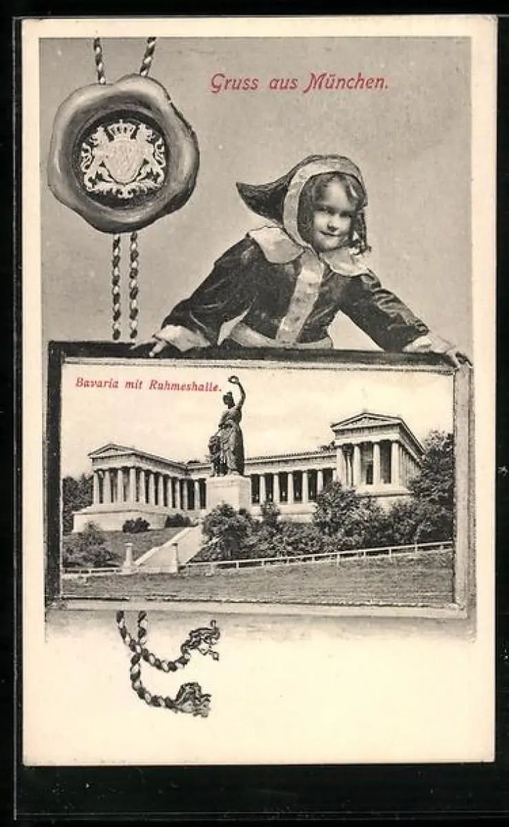 AK München, Münchner Kindl mit Ansicht der Bavaria vor der Ruhmeshalle
