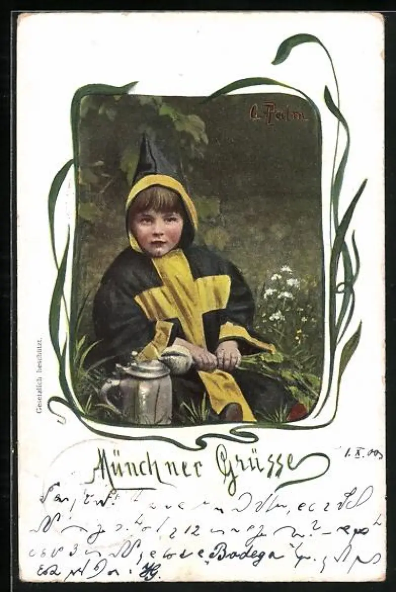 AK München, Münchner Kindl mit Humpen und Radi auf einer Wiese