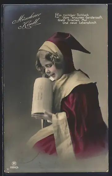 AK München, Münchner Kindl schaut in einen Bierkrug
