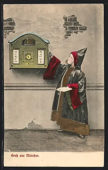 AK München, Münchner Kindl steckt einen Brief in den Kasten