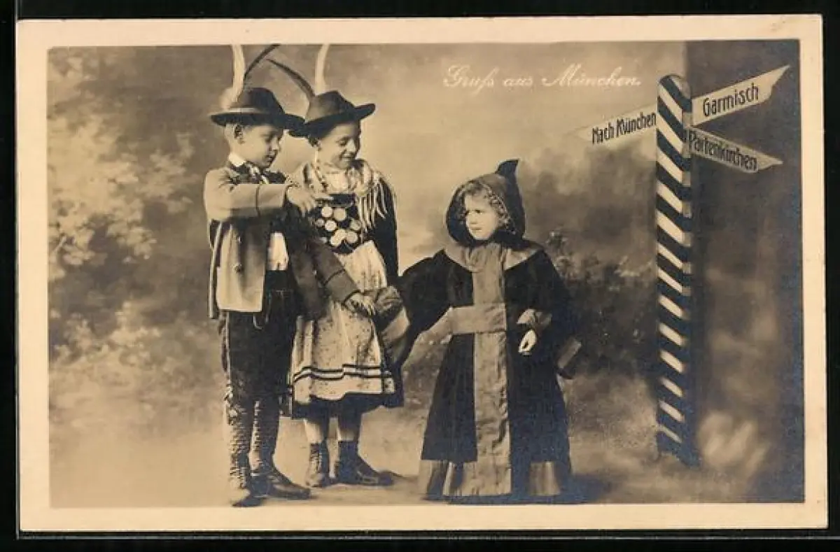 AK München, Münchner Kindl und zwei Kinder am Wegweiser nach München