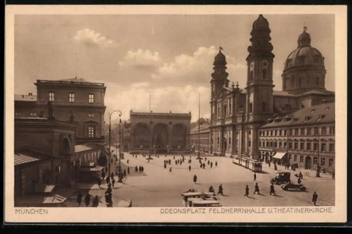 AK München, Odeonsplatz mit Feldherrnhalle, Theatinerkirche u. Strassenbahn