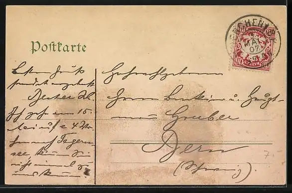 alte Ansichtskarte, gelaufen 1907, Stempelspur, guter Zustand