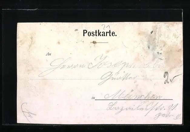 Personenbezogene Daten auf der Rückseite der Karte wurden durch blauen Textmarker unkenntlich gemacht. Die blauen Stellen sind auf die Vorderseite durchgeweicht und wirken sich negativ auf das Postkartenfoto aus