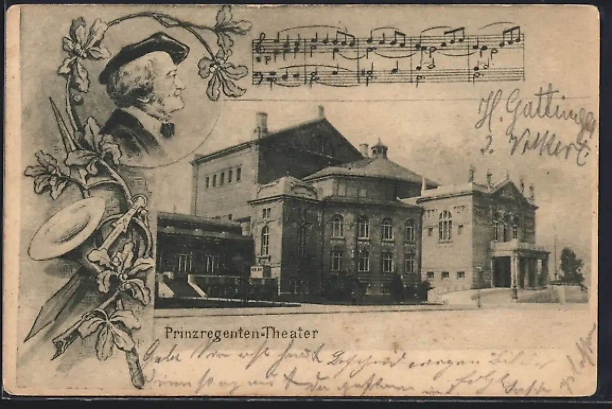 AK München, Prinzregenten-Theater, Richard Wagner, Komponist mit Hut, Musikkomposition