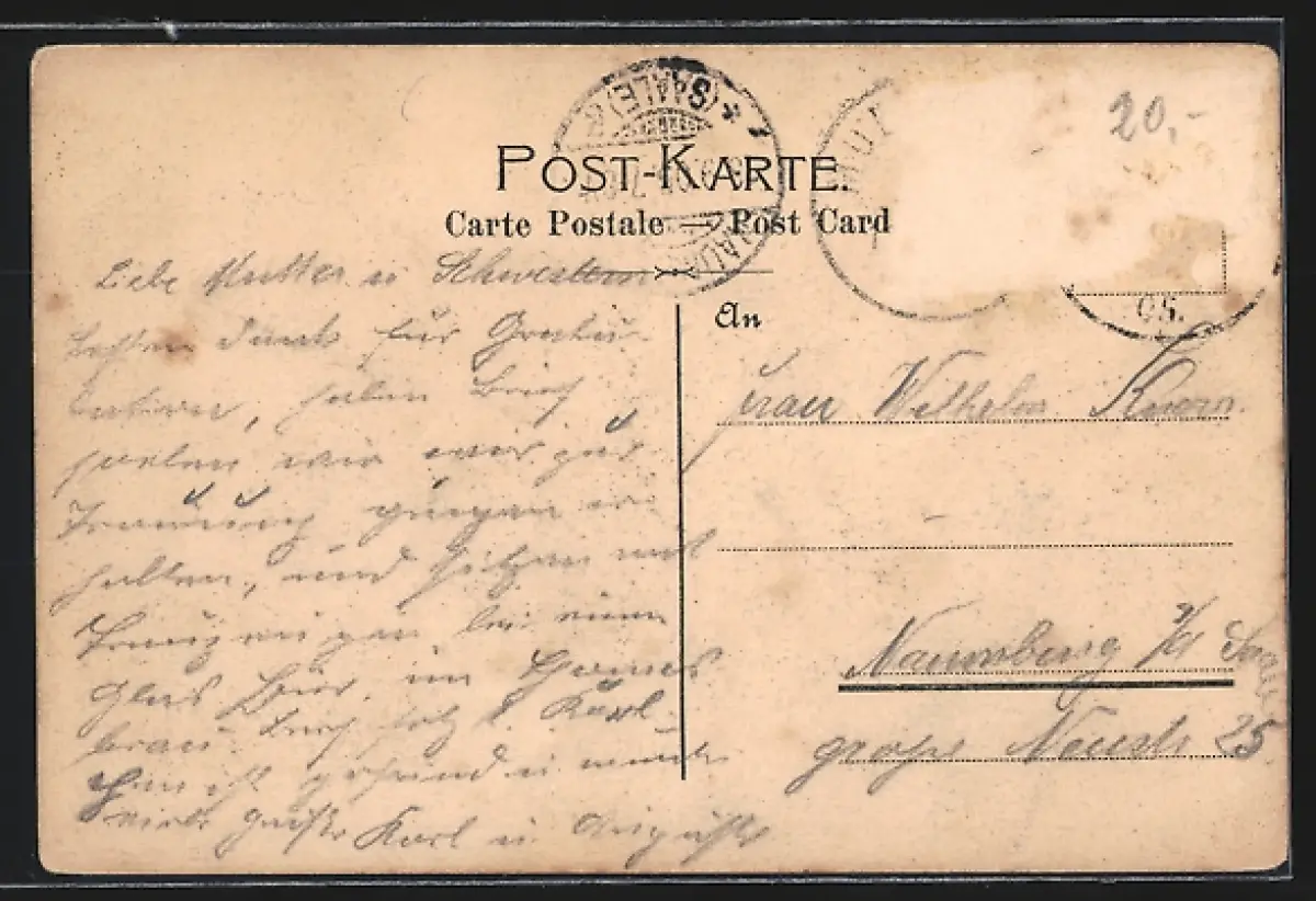 alte Ansichtskarte, gelaufen, Briefmarke entfernt, rückseitig Oberflächenschaden, guter Zustand