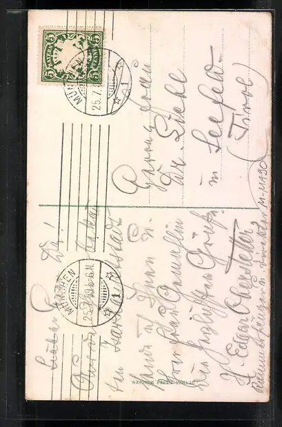 Personenbezogene Daten auf der Rückseite der Karte wurden durch blauen Textmarker unkenntlich gemacht. Die blauen Stellen sind auf die Vorderseite durchgeweicht und wirken sich negativ auf das Postkartenfoto aus