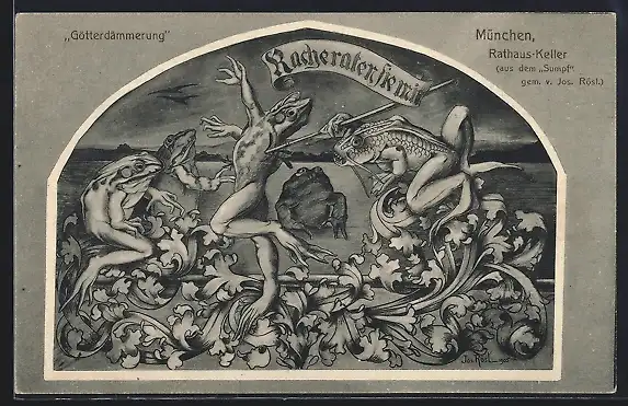 AK München, Rathauskeller, Kampfszene unter Fröschen, Gemälde Götterdämmerung