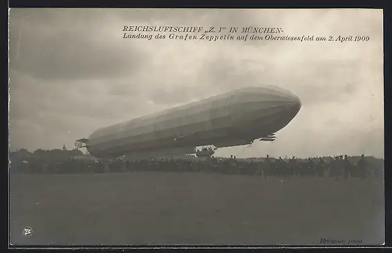 AK München, Reichsluftschiff Z. I., Landung des Grafen Zeppelin auf dem Oberwiesenfeld 1909