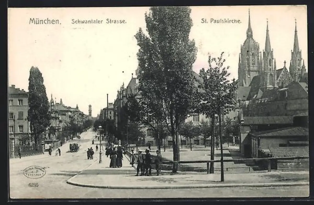 AK München, Schwantaler Strasse mit St. Paulskirche