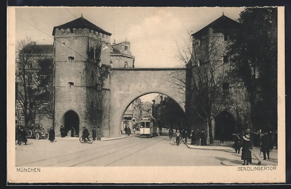 AK München, Sendlingertor mit Strassenbahn-Durchfahrt
