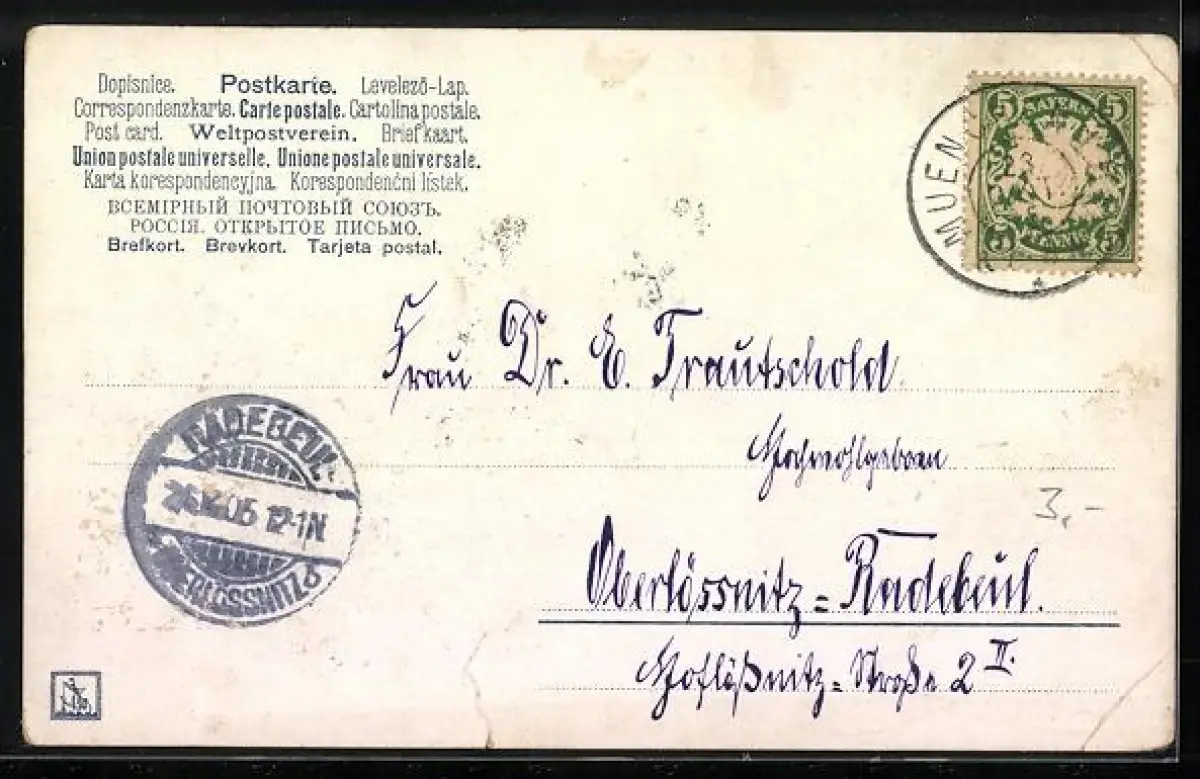 alte Ansichtskarte, gelaufen 1905, Eckknicke li., guter Zustand