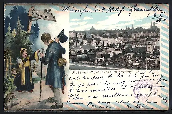 AK München, Sicht über die Festwiese des Oktoberfests, Münchner Kindl weist Wanderer den Weg