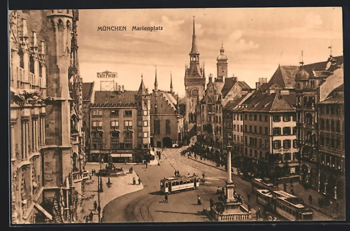 AK München, Strassenbahnverkehr auf dem Marienplatz