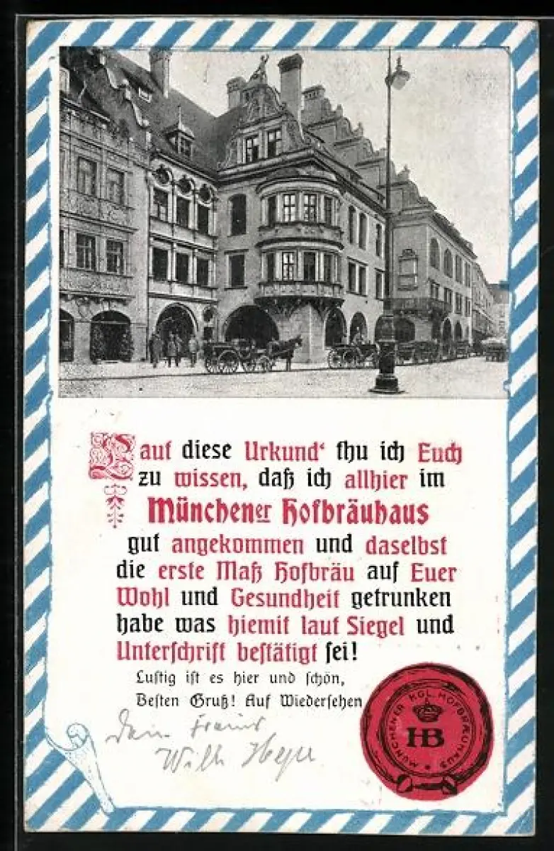 AK München, Urkunde vom Münchner Hofbräuhaus, Strassenpartie mit Pferdekutschen