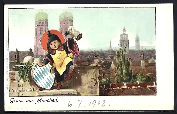 AK München, fideles Münchner Kindl grüsst von einem Dach