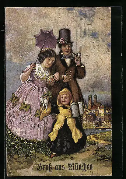 AK Münchner Kindl, Paar in Festkleidung, Mädchen trägt zwei Bierkrüge