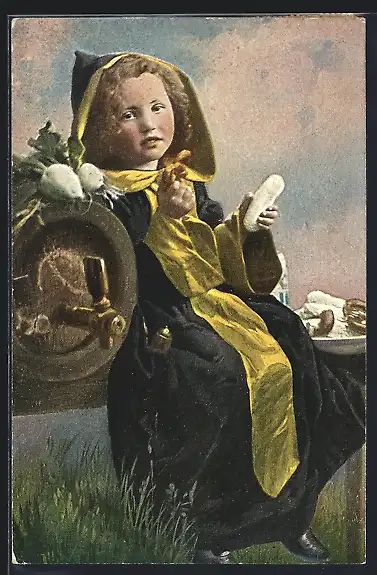 AK Münchner Kindl mit Bierfass, Wurst und Brezel