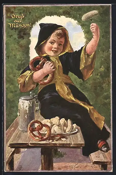 AK Münchner Kindl mit Bierkrug, Brezel und Weisswurst