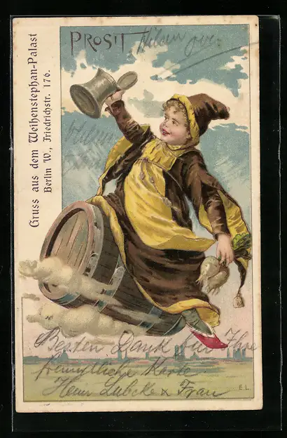 AK Münchner Kindl mit Bierkrug fliegt auf einem Bierfass