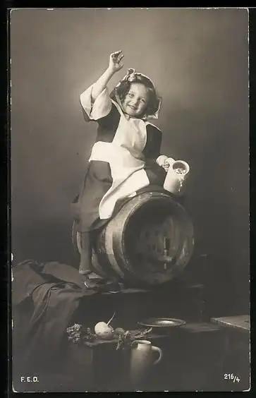 AK Münchner Kindl mit Bierkrug sitzt auf Bierfass