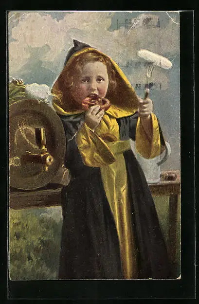 AK Münchner Kindl mit Brezel und Weisswurst am Bierfass