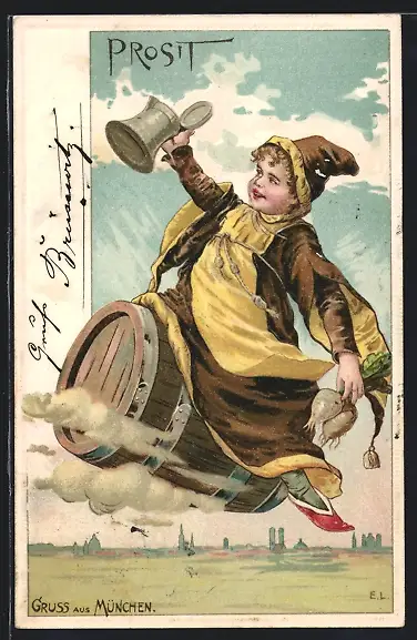 AK Münchner Kindl mit Radi reitet auf einem Bierfass