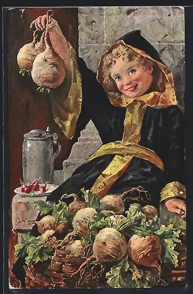 AK Münchner Kindl mit Rettichen und Bierkrug