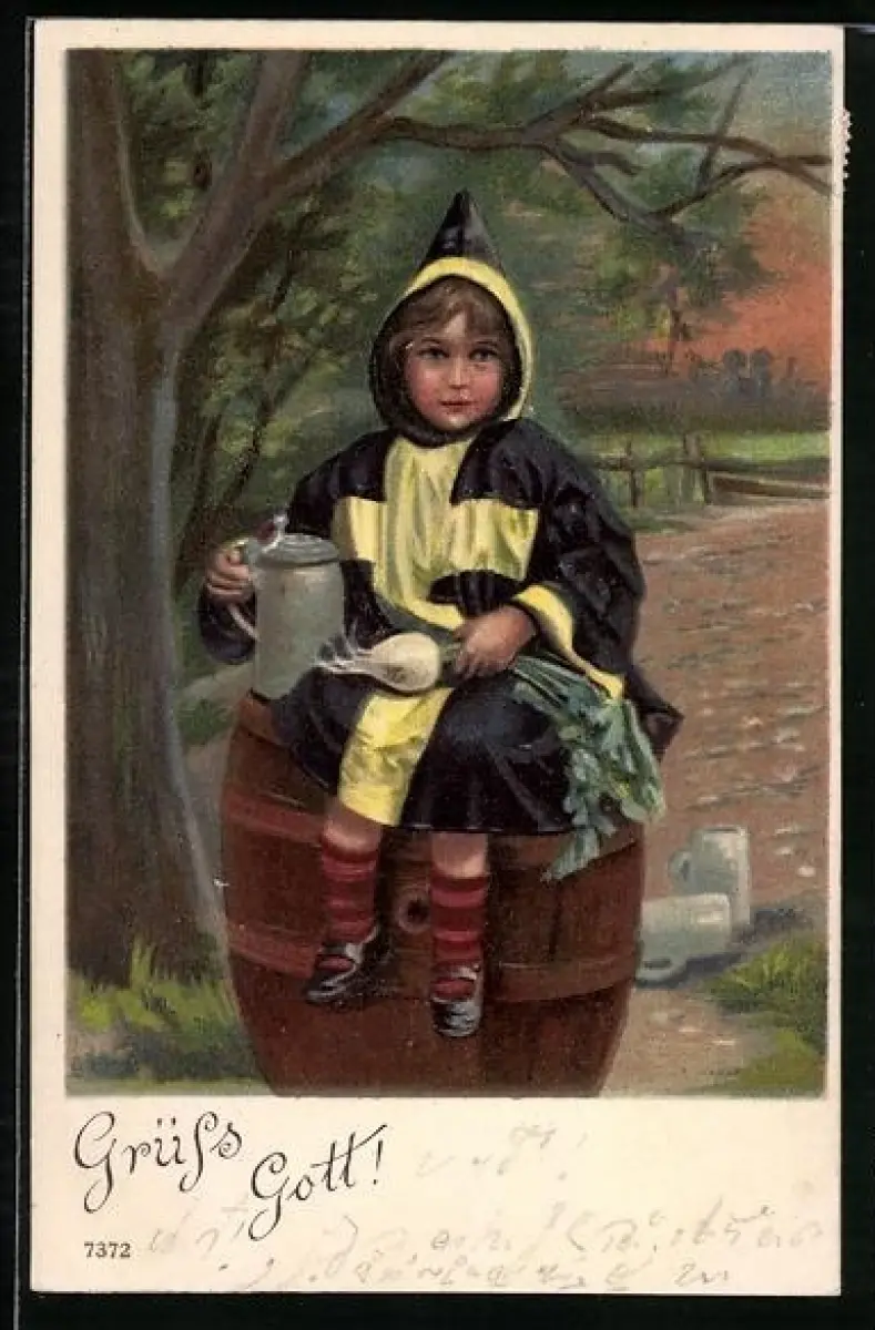 AK Münchner Kindl sitzt auf dem Bierfass mit Massbier und Radi