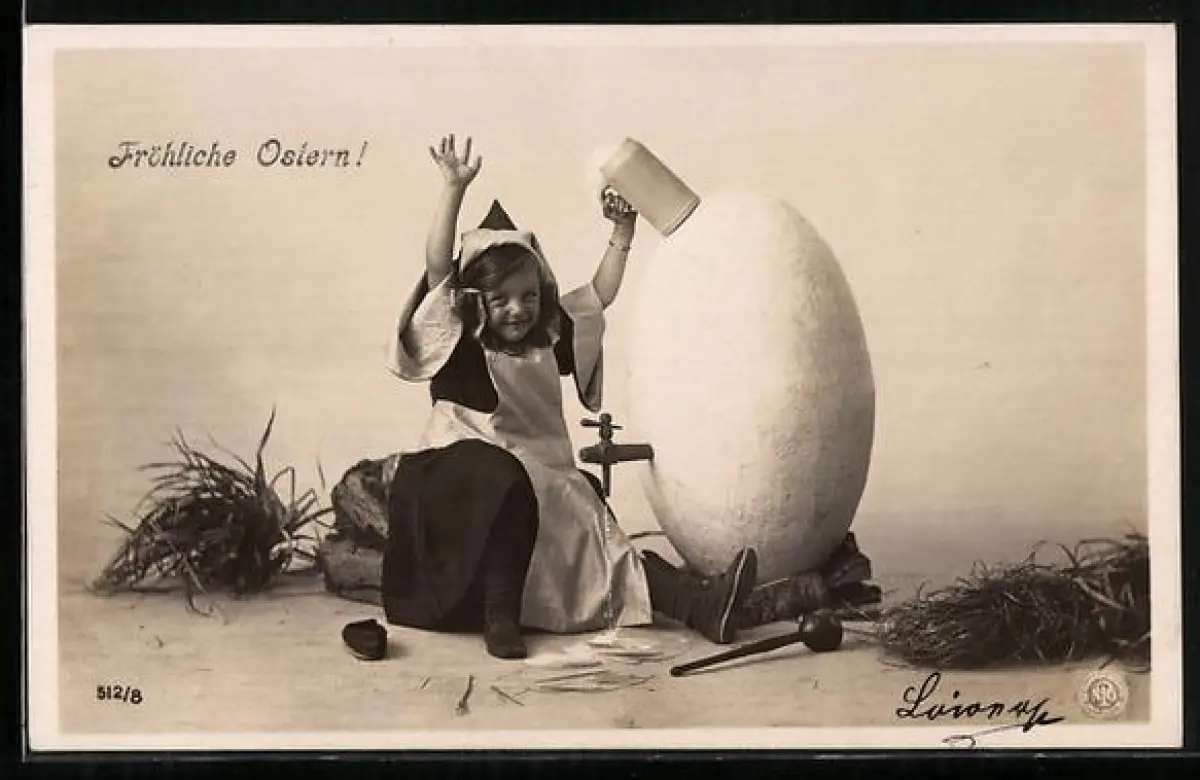 AK Münchner Kindl zapft Bier aus einem Ei, Ostern