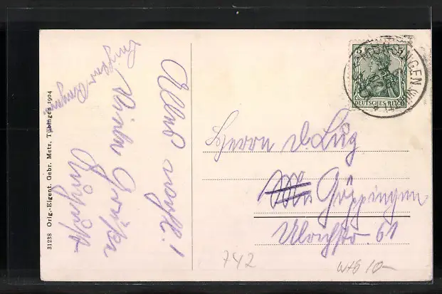 Personenbezogene Daten auf der Rückseite der Karte wurden durch blauen Textmarker unkenntlich gemacht. Die blauen Stellen sind auf die Vorderseite durchgeweicht und wirken sich negativ auf das Postkartenfoto aus