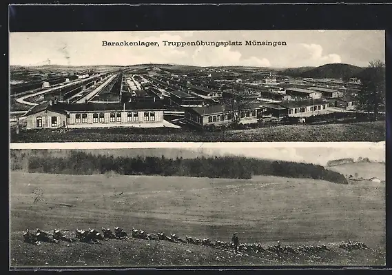 AK Münsingen, Truppenübungsplatz, Barackenlager, Übungen auf dem Feld
