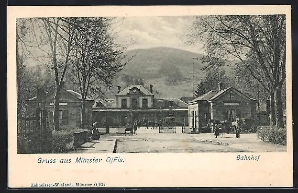 AK Münster /Els., Bahnhof mit Strasse, Panorama