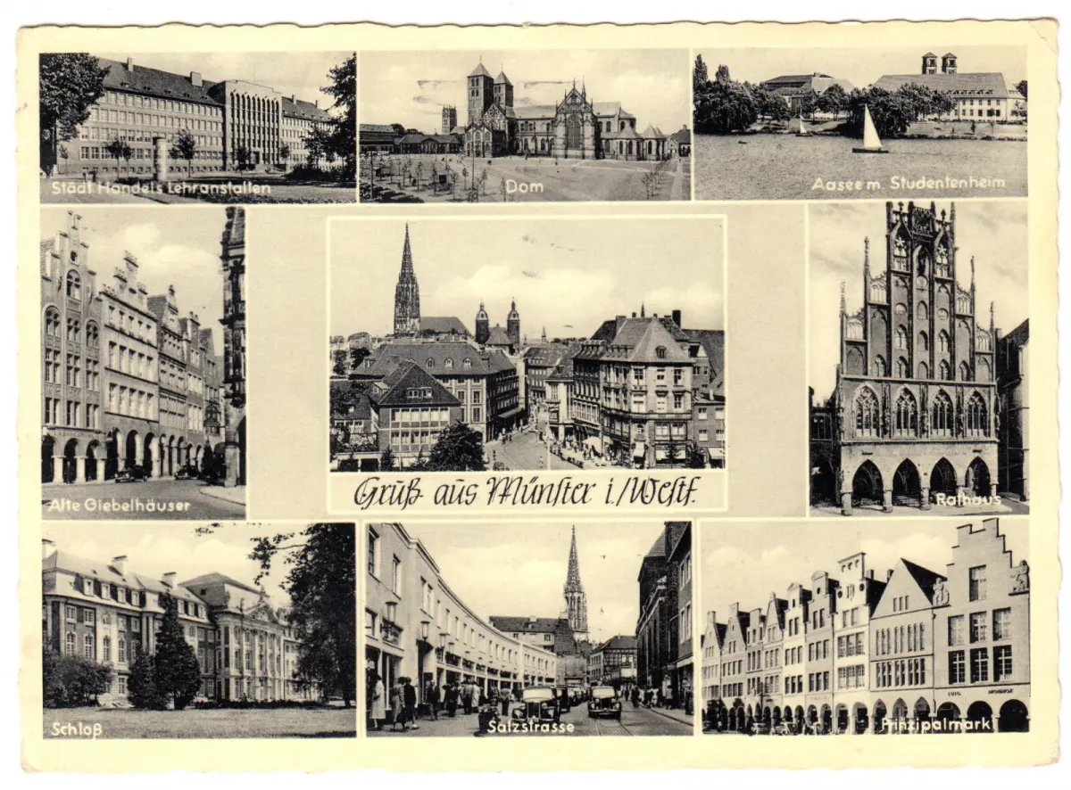postalisch gelaufen, gestempelt: (21a) Münster (Westf) 2, 18.8.55