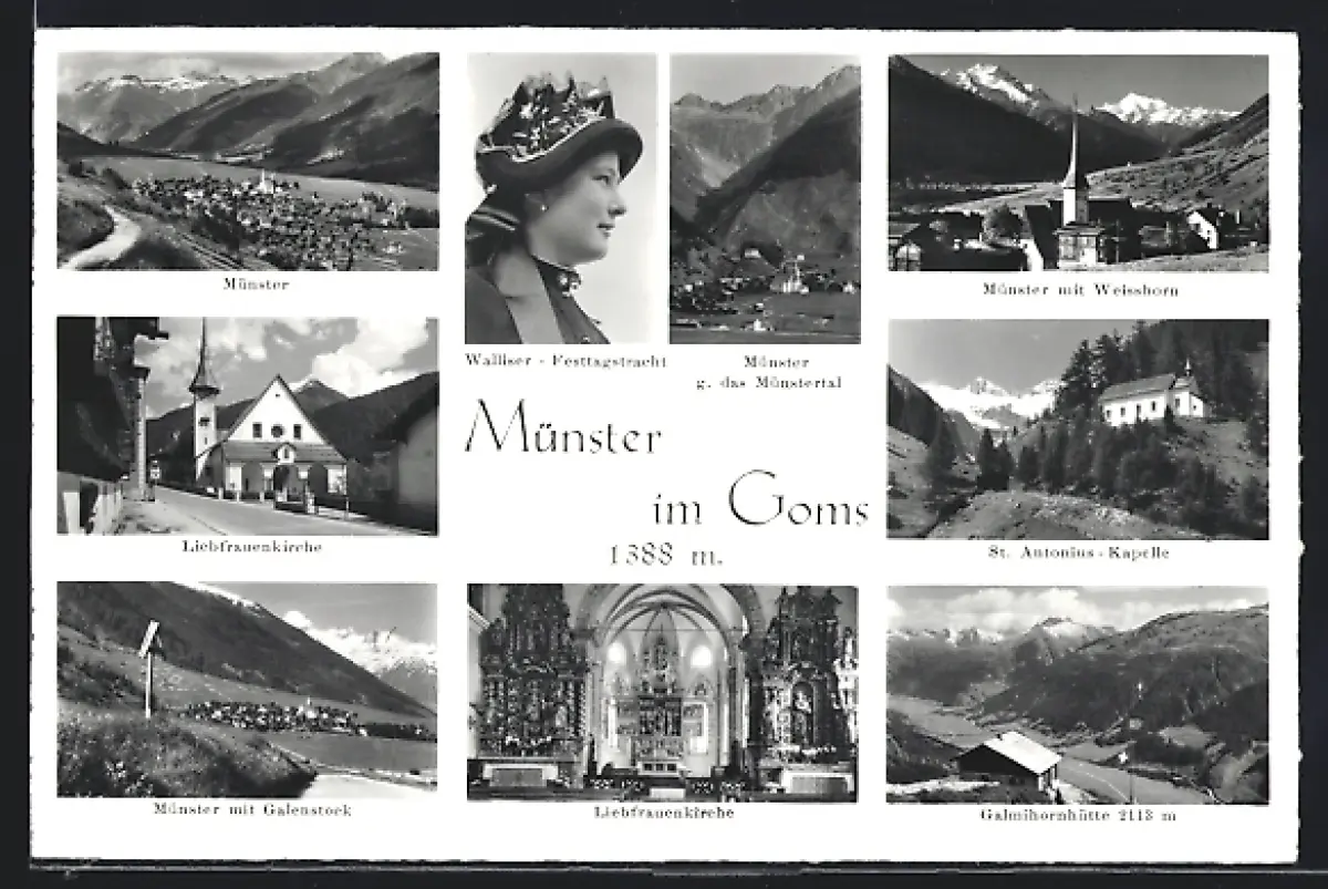 AK Münster im Goms, Liebfrauenkirche, St. Antonius-Kapelle, Galmihornhütte, Dame in Walliser-Festtagstracht