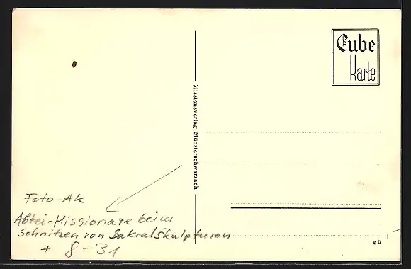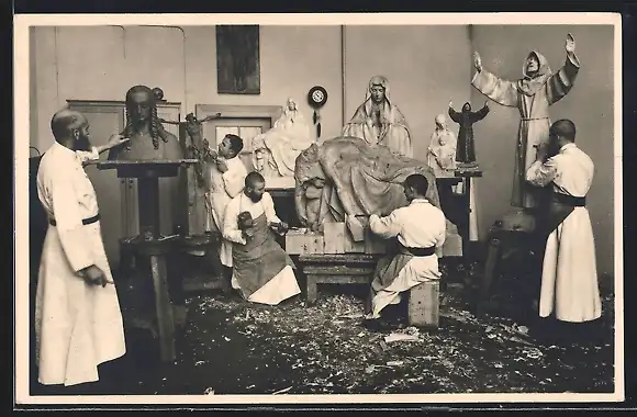 AK Münsterschwarzach, Abtei-Missionare beim Schnitzen von Sakralskulpturen
