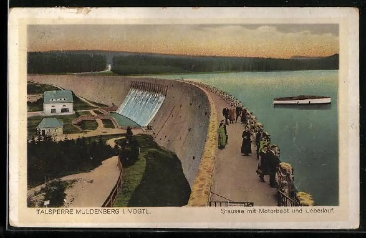 AK Muldenberg i. Vogtl., Stausee mit Motorboot und Überlauf