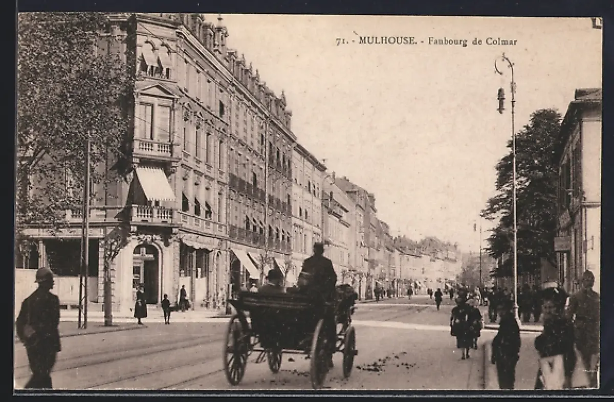 AK Mulhouse, Faubourg de Colmar avec calèche et passants