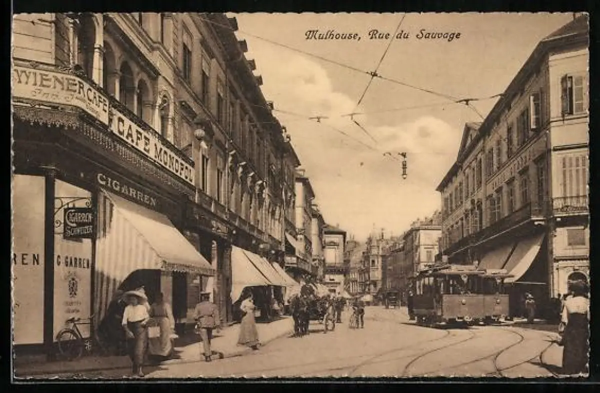 AK Mulhouse, Rue du Sauvage, Strassenbahn