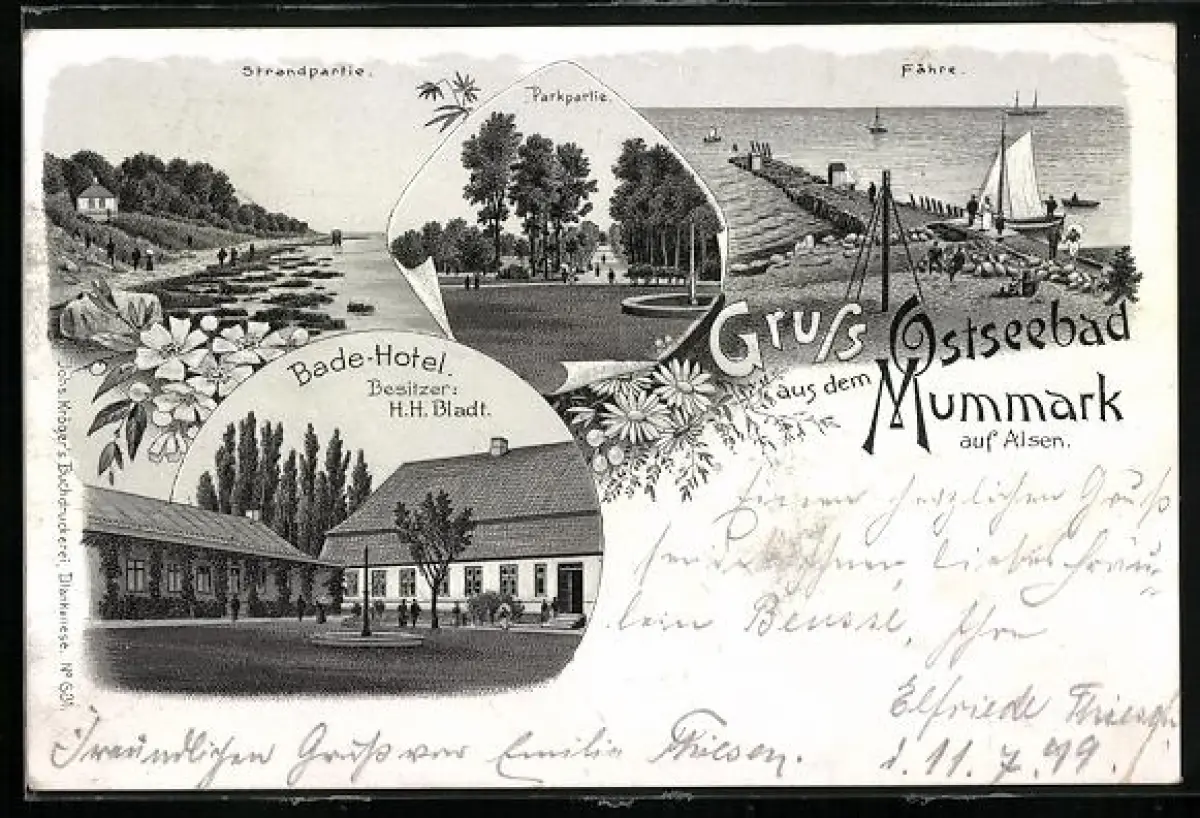 AK Mummark auf Alsen, Bade-Hotel, Besitzer H. H. Bladt, Strandpartie, Parkpartie, Fähre