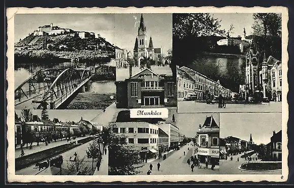AK Munkács, Brücke und Festung, Kirche, Strassenpartien mit Geschäften