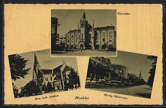 AK Munkács, Róm. kath. Templom, Városháza, Horthy Miklós-utca