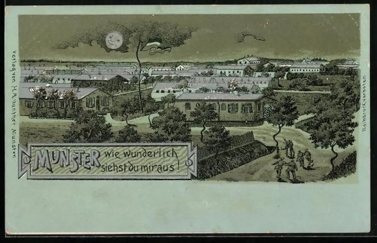 AK Munster, Ansicht des Barackenlagers bei Mondschein