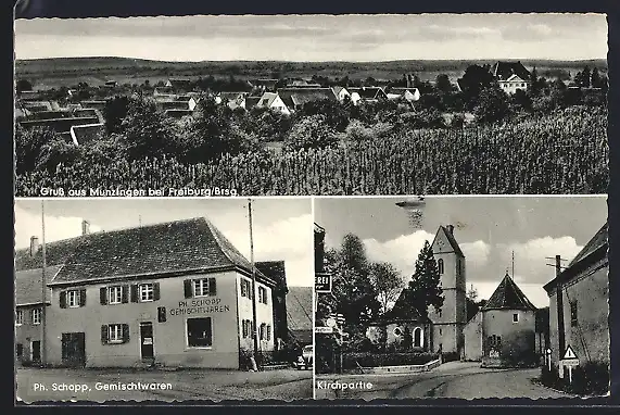 AK Munzingen bei Freiburg, Ph. Schopp Gemischtwaren und Kirchpartie