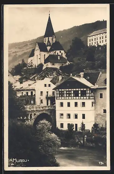 AK Murau, Ortspartie mit Kirche und Murbrücke