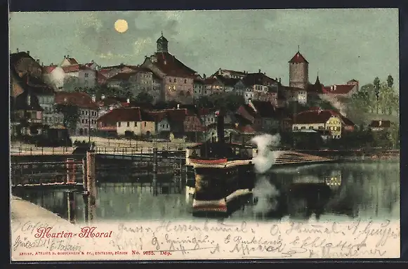 AK Murten /Morat, Ortsansicht mit Dampferanlegestelle bei Vollmond