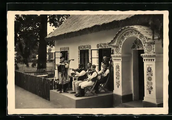 AK Musikanten in tschechischer Tracht musizieren auf einer Terrasse